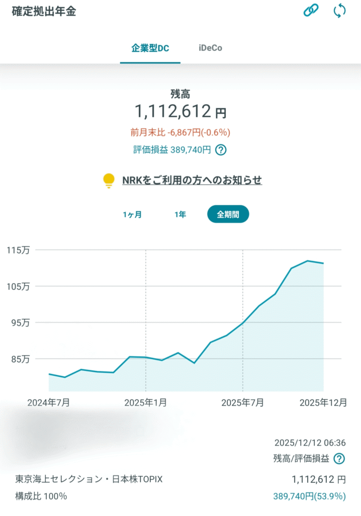 - 数か月間定期預金+物価連動債→TOPIX連動インデックスへスイッチング→海外株式のアクティブファンド商品を追加・マッチング拠出も行う→2024年8月~全商品をTOPIX連動インデックスへスイッチングしてマッチング拠出解除。