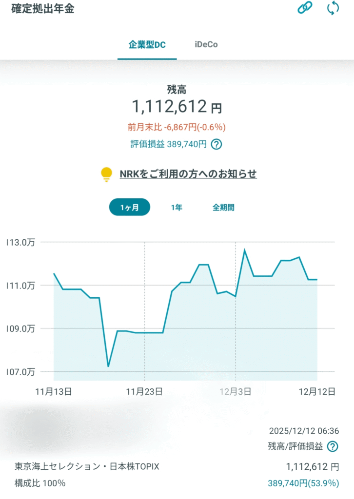 TOPIXは前回公開時点の1,091,776円→1,112,612円で拠出含め+20,836円でした。